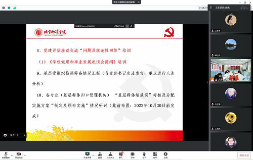 2023届毕业生专业党支部就业促进会等相关工作进行了强调。随后,孙涛老师重点对2022年党建评估座谈名单、党建评估学院内调研走访路线及各节点任务进行了详细梳理,同时针对党建评估座谈交流“提纲”开展了相关业务培训。