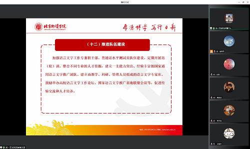 最后,组织开展了关于教育部、国家语委《关于加强高等学校服务国家通用语言文字高质量推广普及的若干意见》。学校是语言文字工作的基础阵地,高等学校在其中发挥着重要作用,应进一步加强高等学校语言文字工作,充分发挥高等学校在服务国家通用语言文字高质量推广普及中的作用。以习近平新时代中国特色社会主义思想为指导,深入贯彻落实党的二十大精神,全面落实习近平总书记关于教育的重要论述和关于语言文化的重要指示批示精神,聚焦高质量推广普及国家通用语言文字,将语言文字工作与高校人才培养、科学研究、社会服务、文化传承创新和国际交流合作等有机融合,更好服务教育和语言文字事业高质量发展,为教育强国和文化强国建设贡献力量。