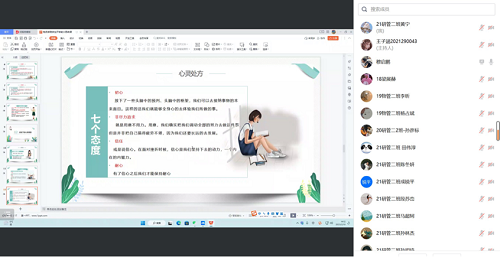 随后,穆启鹏老师还介绍了疫情下的心理调整办法。穆老师谈到,大学生具有探索世界,连接他人;情绪丰富,易于行动等心理特点。让自身放松下来是较为有效的调整方法,可以尝试训练身心两方面的运动如瑜伽、八段锦等,同时李老师还向同学们介绍了7个“应对多变化环境,保持稳定”的态度,分别是:非评价、接纳、放下、初心、非尽力追求、耐心、信任,并解读了相关含义。