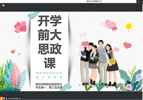 物流管理专业学生第一、三党支部通过腾讯会议的形式开展第六次疫情防控“大思政课”。内容围绕开学政策解读、疫情下的心理调整、开学前的状态调整这三部分对学生们进行宣传教育,物流管理专业学生第一、三党支部纵向管理下的各个本科生班级、研究生班组的全体学生参加了本次宣传教育活动,本次宣讲活动由尤物视频