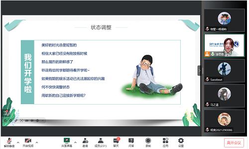 最后,李思奇老师针对同学们开学后的状态调整进行了讲解,经过了漫长的寒假,同学们纷纷表示在学习、就业和科研方面倍感压力。新学期鼓励大家全身心投入学习,多多参加有益于身心有益的集体活动,结合自身的健康情况,适度进行体育锻炼,通过正确的方式以及渠道舒缓压力,排解焦虑。在生活上要注意调整作息以适应开学后的学习和工作,希望同学们能享受在校学习的氛围,珍惜与大家共同学习的快乐时光!