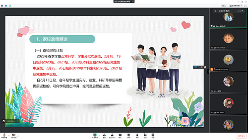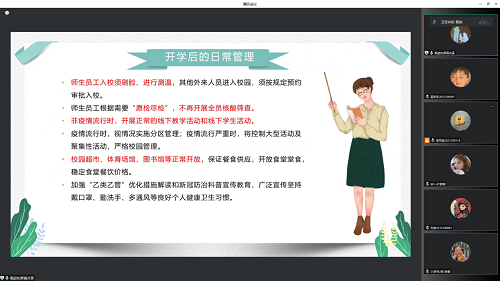 随后,甄姿老师着重讲解了本次返校的相关政策,强调并解读了返校时间计划、返校条件等几个方面。本次返校时间计划,不同年级,不同时间分阶段返校。在目前疫情形势下,最大程度保证学生身体健康的同时按时开学,全体同学需要符合返校条件,做好自身防护,为自己负责,同时也为同学和老师负责。
