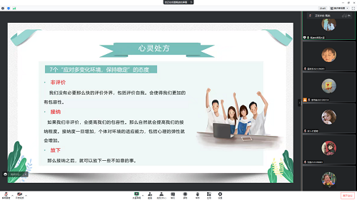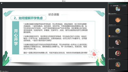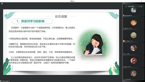 最后,甄姿老师向同学们讲解了开学前如何做好自身状态的调整,从熬夜学习和缓解开学焦虑两大方面入手,细致讲解了焦虑产生的原因和缓解的办法。甄姿老师多次强调,同学们要做好自身健康的第一责任人,努力调整好状态,以精神饱满的状态迎接开学。