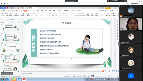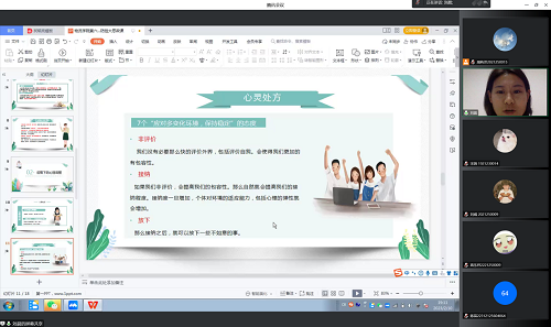 接着,刘晨老师讲解了在疫情下如何进行心里调整。大学生具有探索世界,连接他人;情绪丰富,易于行动等心理特点。让自身放松下来是较为有效的调整方法,同学们可以尝试训练身心两方面的运动如瑜伽、八段锦等,同时刘晨老师还向同学们介绍了7个“应对多变化环境,保持稳定”的态度,分别为:非评价、接纳、放下、初心、非尽力追求、耐心、信任,并解读了相关含义,希望同学们保持良好的心态。