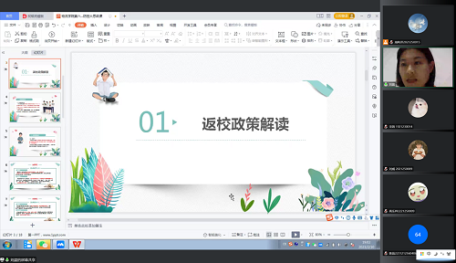 首先,刘晨老师向同学们详细解读了返校相关时间安排及政策安排。刘晨老师讲到:学生分批次返校。2月18、19日组织2020级、2021级、2022级本科生和2022级研究生集中返校,2月25、26日组织2019级本科生和2020级、2021级研究生集中返校。希望同学们在返京返校途中做好个人防护工作,乘坐公共交通工具返校的同学,要全程规范佩戴N95或KN95口罩,做好手部消毒,最大限度防范路途感染,保护好自己,做好自身健康的第一责任人。
