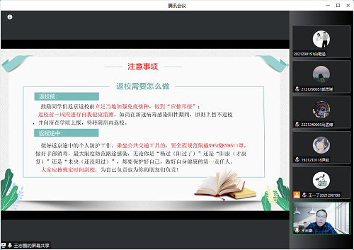 本次大思政课主要围绕返校政策解读、疫情影响下学生们所产生的心理问题调整方法以及开学前状态调整三个方面展开。首先对当下的返校政策和返校的注意事项进行了详细介绍,希望同学们在新学期伊始,能够严格遵守学校要求,分批次、安全、有序返校。并对同学们提出的返校相关问题进行了详细解答,强调大家要时刻做好自身防护,做自身健康的第一责任人。