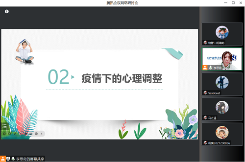 随后,各党支部书记还介绍了疫情条件下做好个体心理调适的“心灵处方”。大学生具有“探索世界,连接他人;情绪丰富,易于行动”等心理特点,我们要学会在生活中放松心情,调整心态,直面压力和挑战,对于身处的多变化环境,要时刻保持稳定,不忘初心。