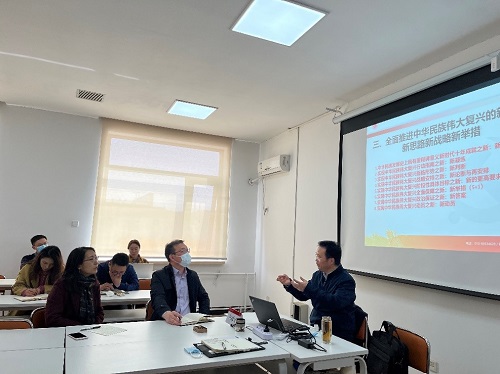 接着,刘耀京教授从中华民族伟大复兴的角度为参加活动的师生梳理了党的二十大报告,讲述了实现中华民族伟大复兴面临的新形势,以及实现中华民族伟大复兴战略的新目标、新安排、新保障、新举措和行动指南。围绕教师教学、科研主业着重阐述了党的二十大报告中关于教育、科技、人才工作的重要精神,深入分析了中华民族伟大复兴对教育、科技、人才提出的新要求。指出教育、科技、人才是全面建设社会主义现代化国家的基础性和战略性支撑,强调科技是第一生产力,人才是第一资源,创新是第一动力。