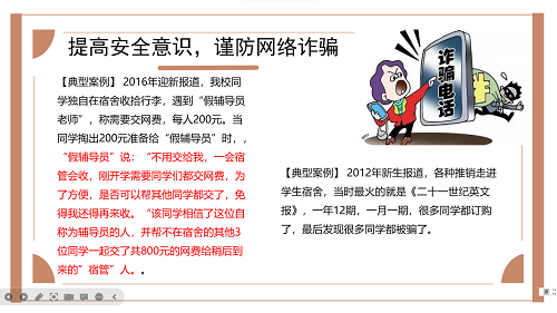 对于近期频发的网络诈骗案件,甄姿老师也进行了重点教育,着重强调了网络诈骗以及如何防范,列举了辅导员身边的事例提醒同学们:凡是遇到自称公检法要求汇款的,凡是遇到叫您汇款到“安全账户”的,凡是遇到通知中奖、领奖要您先交钱的都是诈骗行为。提醒同学不要随意泄露个人信息、不贪小便宜、不办看起来优惠的借贷,提高防范网络诈骗的意识,同时也不去诈骗别人。