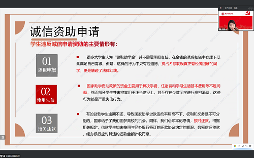 首先,刘晨老师向同学们展示了当代大学生应该做到的几方面诚信。刘晨老师讲到:作为新时代大学生我们应该做到第一,学习诚信。对待学习要态度端正,严谨求实;第二,经济诚信,要以信立人,履约践诺;第三,生活诚信。要在生活中遵纪守法,弘扬正气;第四,灾害、疫情诚信,在灾害、疫情面前同学们要以诚信为本,操守为重。做到不信谣,不传谣。