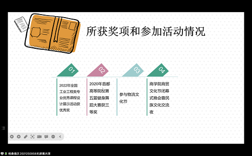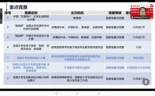 竞赛经验丰富的学生党员列举了许多重点竞赛,同时介绍了一些竞赛信息来源。着重介绍了“互联网+”创新创业大赛、挑战杯课外学术作品竞赛、挑战杯创业计划竞赛“三大赛事”,分析了“三大赛事”的不同侧重点。接着从项目的构思、团队的组建、项目中期进行,经验总结这四个方面做了详细地分享并结合个人的参赛经验,阐述了筹备赛时要注意的事项。