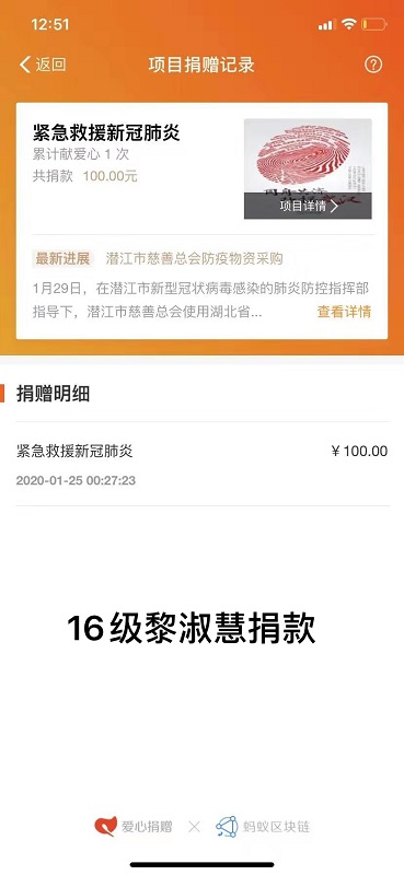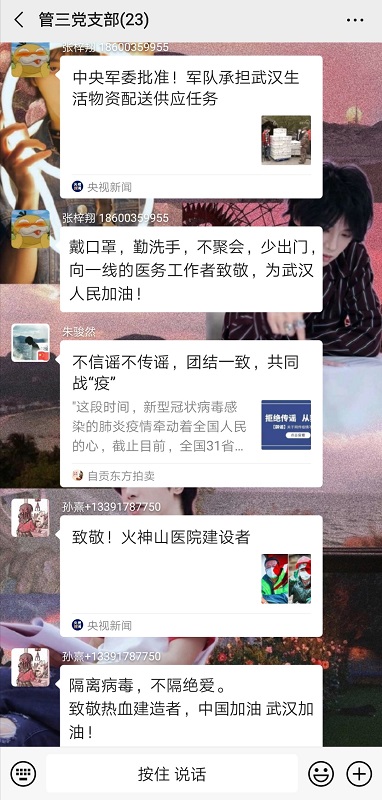 物流管理专业学生第二党支部的学生党员们在疫情防控期间,全程保持高度重视,听从统一部署,自觉居家隔离。全员积极关注疫情动态及舆论导向,面对近来“双黄连”、“红十字会”等甚嚣尘上的热点话题,保持理性的辨别能力,不造谣、不传谣,通过网络、微信群向身边的亲友做正确的思想引导和心理疏导。2017级研究生党员李康系湖北武汉人,身体状况良好,在疫情期间,严格听从上级指挥,在家隔离,足不出户。2016级本科生党员张梓宜,在疫情期间曾向武汉捐款捐物两次,第一次向武汉慈善总会捐款128元,第二次与朋友共同参与捐赠医疗资源(护目镜)活动,直接交付黄石市中心医院保障部、华中科技大学同济医学院附属协和医院麻醉与危重病教研室。面对疫情,物流管理专业学生第二党支部的学生党员们在行动。