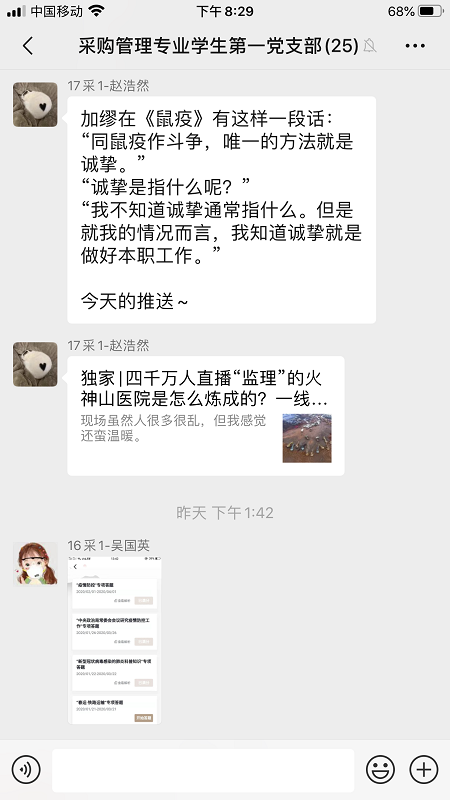 采购管理专业学生第一党支部的学生党员们在疫情防控期间,以身作则,通过学习强国学习防疫的专项知识,在交流群内分享相关信息,宣传疫情防控工作,带领同学服从学校及当地防疫要求,积极为同学做好心理疏导及在线学习指导,积极协助辅导员开展疫情摸排、健康监测与管理工作。2018级研究生党员胡雪琴系湖北武汉人,她正处于本次疫情爆发的源头,她发挥党员精神,主动向家人和亲友普及本次疫情的预防知识,提高对疫情的警惕性,积极响应钟南山院士和医护人员号召,做到不出门、不串门、不聚餐、不上街,最大程度降低疫情扩散风险;她还向韩红基金会捐款200元,以全家的名义在网上购买500个护目镜价值3.69万元送往武汉协和医院;在此期间,她与老师、同学保持联系,积极配合老师、班长的工作。2016级本科生党员狐慧琴自备消毒用品,主动为村口及村民的房前屋后以及社区喷洒消毒液,进行消毒处理。2017级本科生党员赵浩然通过不同渠道为武汉捐款60元,积极配合学校数据统计工作,在网络社交中转发辟谣信息,遵守防疫的要求准则。面对疫情,采购管理专业学生第一党支部的学生党员们在行动。