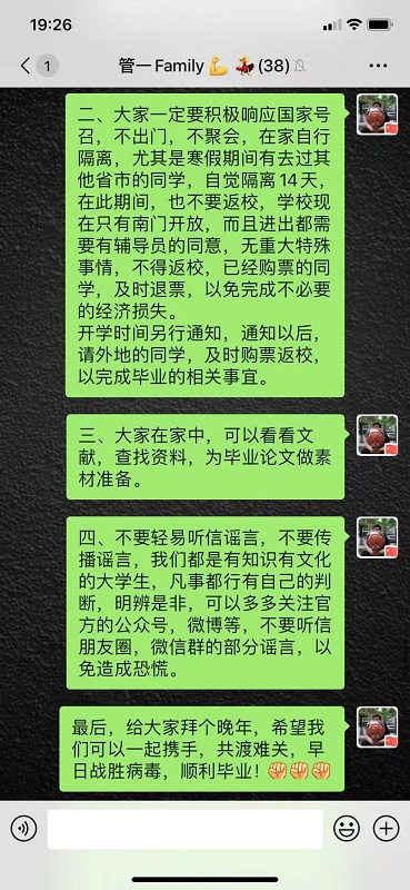 物流管理专业学生第三党支部的学生党员们在疫情防控期间,坚决贯彻党中央决策部署,积极响应学校号召,带头宣传防范知识,做好学生的思想工作及心理疏导。自觉遵守党员个人居住地疫情防控要求,主动配合并协助居住地疫情防疫工作。积极主动做好班级同学的排查与宣传工作,并通过国家、政府权威部门、主流媒体和官方网站获得疫情最新信息,不造谣、不信谣、不传谣,自觉向身边亲友科普疫情防治知识,带头做防控知识的传播者、疫情谣言的制止者、健康校园的守护者。在主动做好自身防护的同时引导周围其他人员做好疫情防控工作,不去人员密集场所,带头并劝导亲友在家不出门、不聚会、不参与集中性活动。保持良好的卫生习惯,时刻注意自己的身体健康情况。面对疫情,物流管理专业学生第三党支部的学生党员们在行动。
