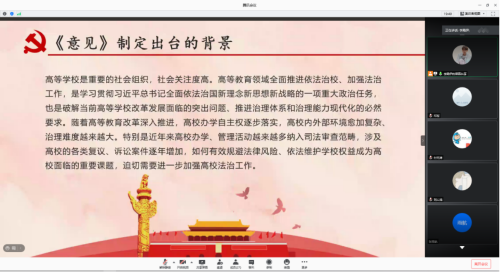 本次党课主要从“教育部关于进一步加强高等学校法治工作的意见内容”、“内容解读”两个部分进行学习。