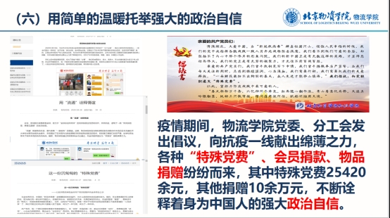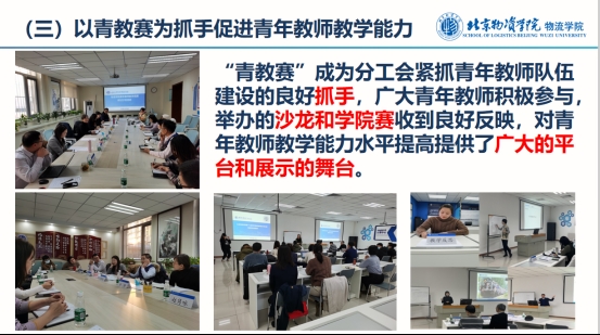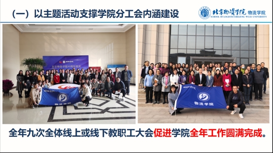 第六届工会会员代表大会第三次会议大会报告表扬。二是以青教赛为抓手不断促进青年教师教学能力水平。分工会高度重视青年教师发展,在青教赛赛制基础上,举办“教学沙龙活动”,邀请学校优秀青年教师代表现场经验分享,邀请教师发展中心和人事处分析青年教师发展规划,广大青年教师受益良多。三是以主题活动支撑学院分工会内涵建设。带领教职工参观京东“亚洲一号”智能物流园促进学院应用型建设;召开9次全体教职工大会促进学院基础工作有序开展;举办各项体育文艺健身活动不断促进教职工身心健康;倡议全体教职工为全国及国际兄弟院校抗疫捐款捐物,用简单的温暖托举强大的政治自信。