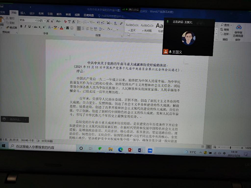 首先,党支部书记王国义向大家传达关于召开2021年度基层党支部组织生活会和开展民主评议党员的通知,根据通知要求,老师们集体学习了《中共中央关于党的百年奋斗重大成就和历史经验的决议》,刘艳老师畅谈了自己党校学习感受,与大家分享了其在前线客户端发表的文章《中国共产党公平正义观的历史演进》,大家一致认为,中国共产党成立以来,始终把为中国人民谋幸福、为中华民族谋复兴作为自己的初心使命,我们应牢记初心与使命,在自己的工作岗位上做出应有的贡献。