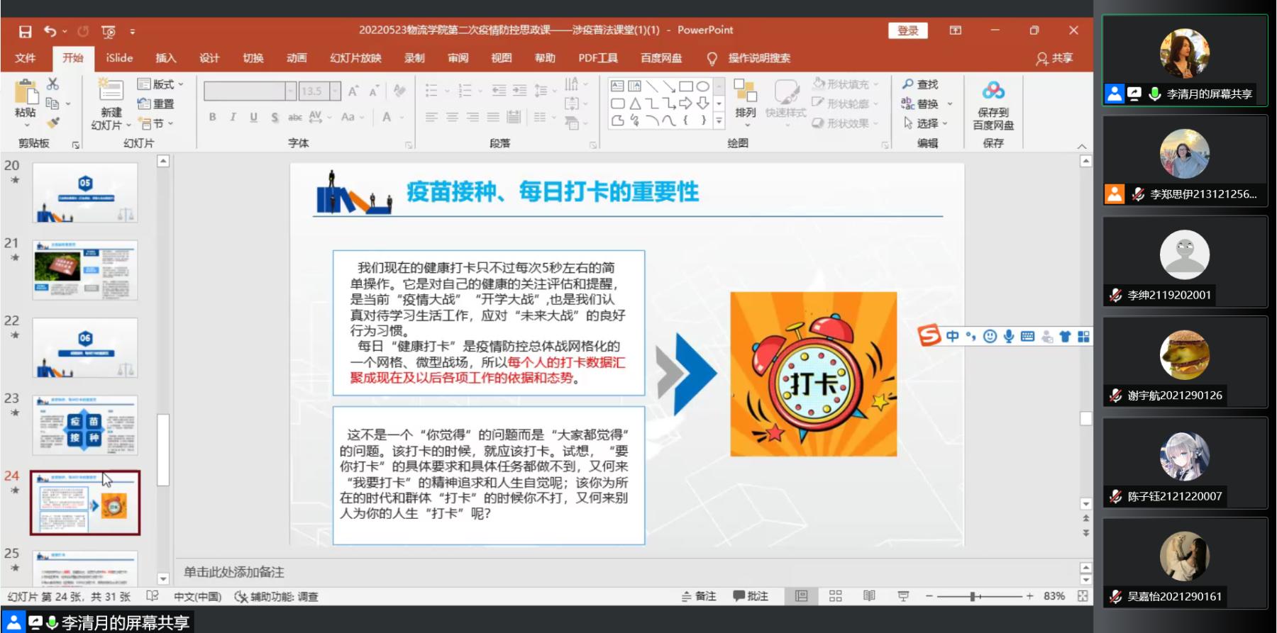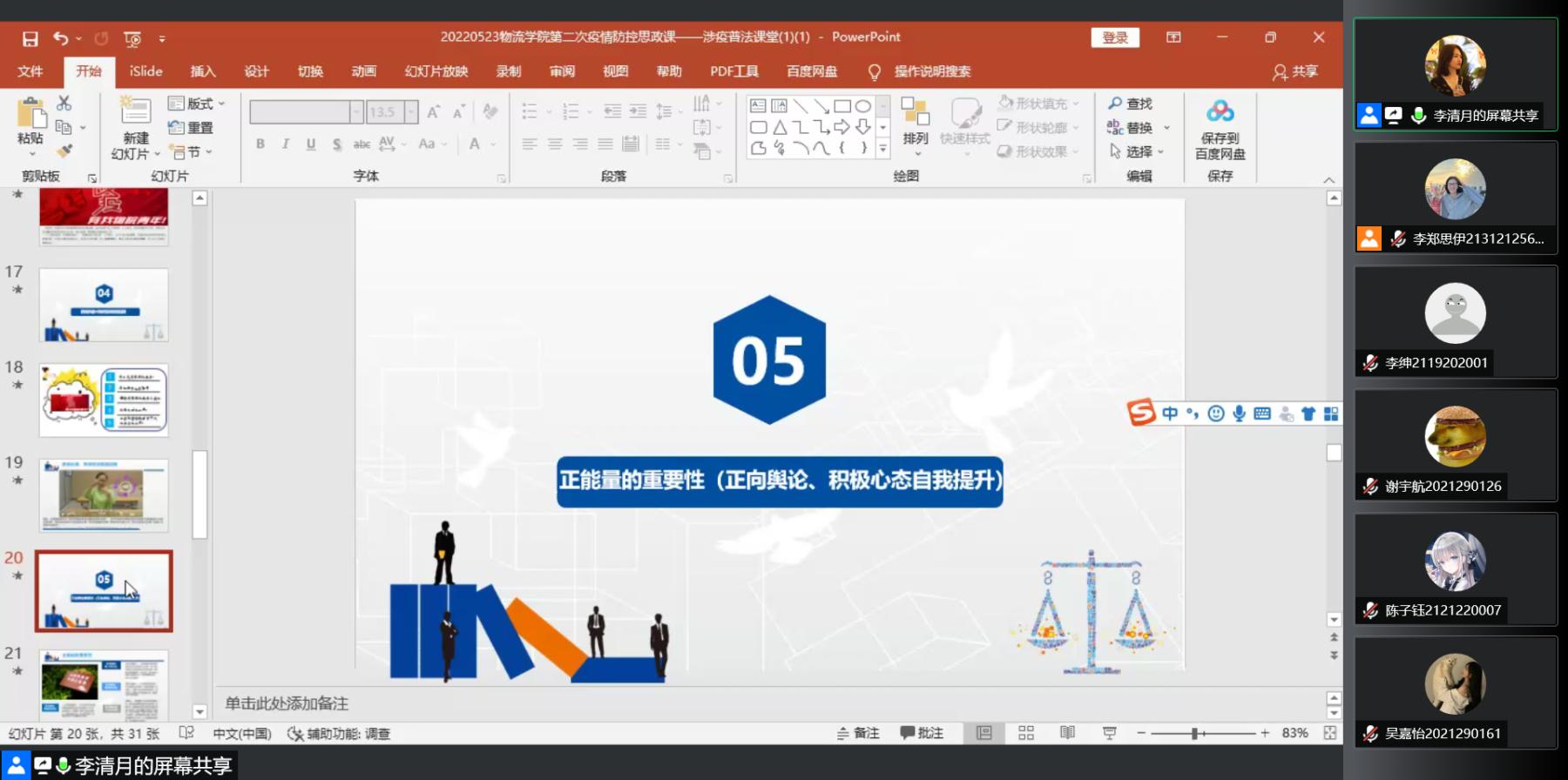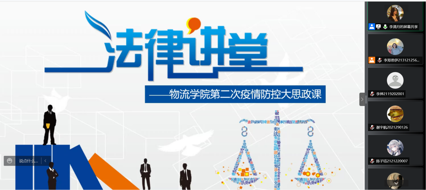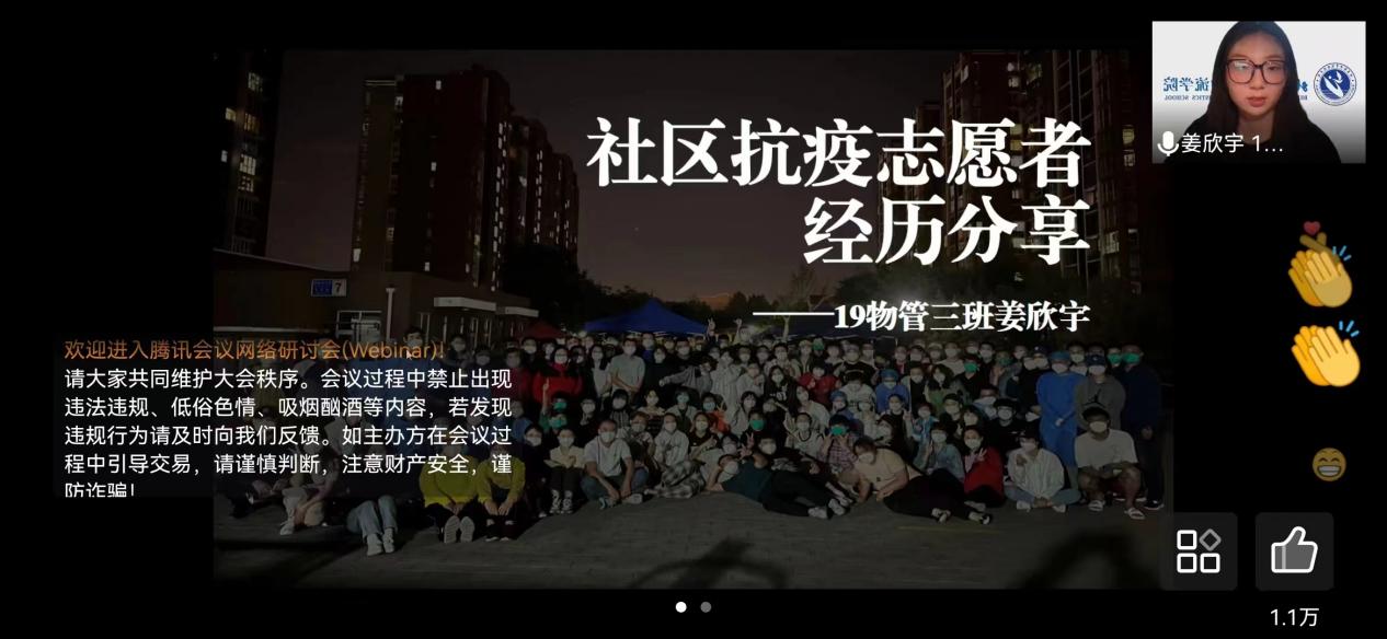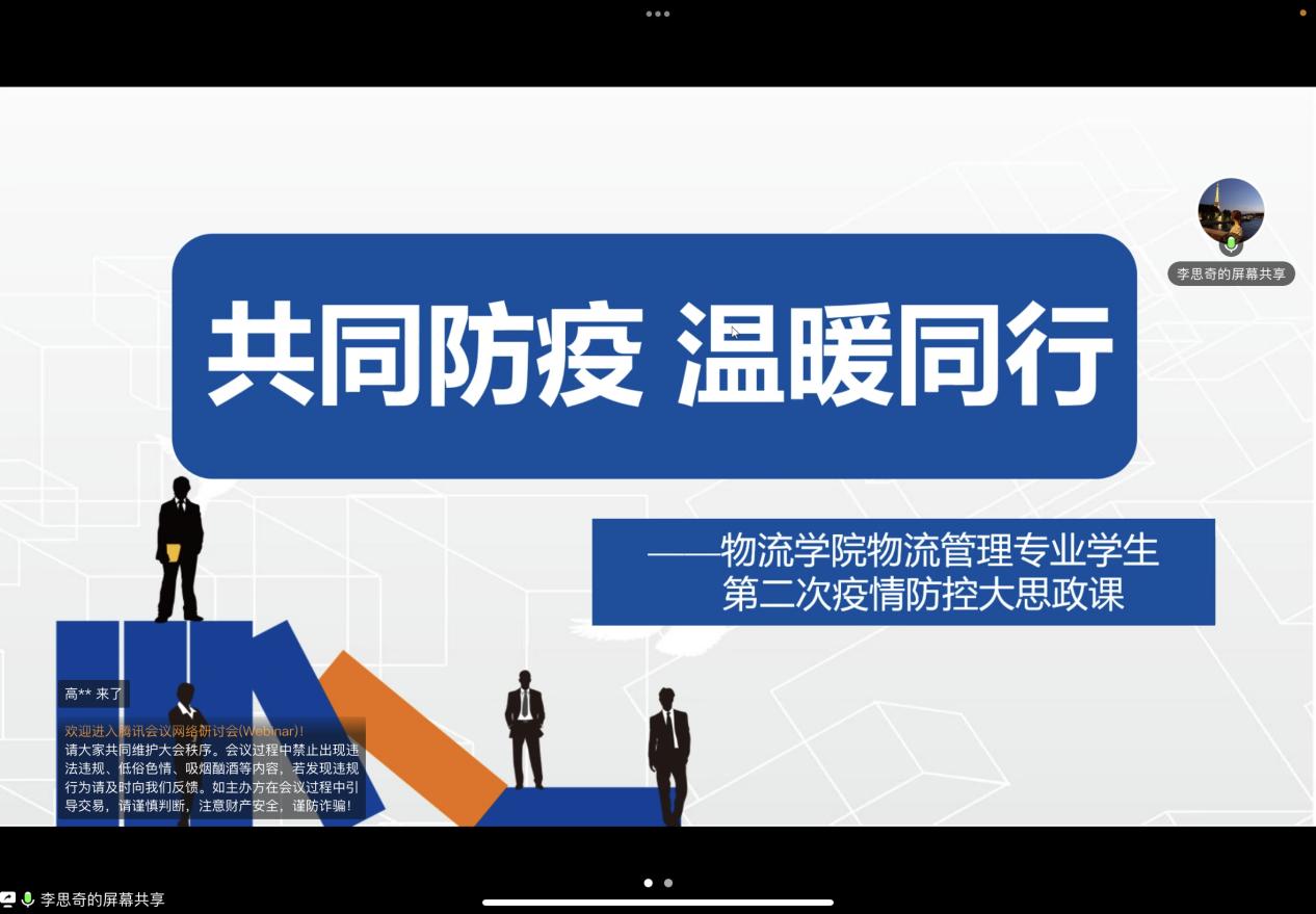 针对“如何抗原自测”,课上又重点进行了回顾和讲解,并强调了疫情时期正能量的重要性。特殊时期,同学们难免会出现一系列不同于平常的情绪反应,一直维持积极的情绪状态或许并不容易,各种各样的负面情绪都会来敲门,比如焦虑、恐慌、紧张等,这些情绪都是任何人在应对特殊事件时的正常反应。可以通过听音乐、阅读有趣的书籍、体育锻炼等方式来调节情绪,转移注意力,适当调节和调整。课上也邀请了一些学生代表们从不同的角度分享了自己疫情下的生活,比如,物流管理专业学生第三党支部书记秦子楚同学以“党团班一体化,凝聚强大战斗力”从学生党支部的角度鼓励党员同学们实现“自控”+“群控”双提升,号召广大学生党员争做引领者;19级物流管理专业三班的姜欣宇同学与大家分享了作为社区抗疫志愿者,从负责流调核单工作到社区公众号新闻撰写等15天的疫情防控志愿经历。
