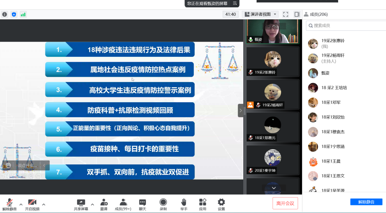 各专业党支部负责辅导员首先结合目前严峻、复杂的疫情防控形势,特别是近期社会面出现的中铁十一局三公司、海淀友谊社区等几起聚集性疫情案例,要求大家从思想上要引起重视,不扎堆、不聚集、非必要不流动、非必要不外出;同时,结合近期社会面以及高校出现的违反疫情防控法律规定的案例,要求大家要知法懂法、认真守法,严格遵守属地和学校的疫情防控要求,按要求佩戴口罩、按要求参加核酸检测,相关涉疫同学严格服从统一管理,自觉配合落位管控、复核转运、流调溯源等相关工作,不信谣、不传谣;最后,希望大家调整好心态,严格落实每日健康打卡、疫苗接种应接尽接的要求,调整心态,严以律己,认真做好线上学习、期末备考、论文写作、求职就业。