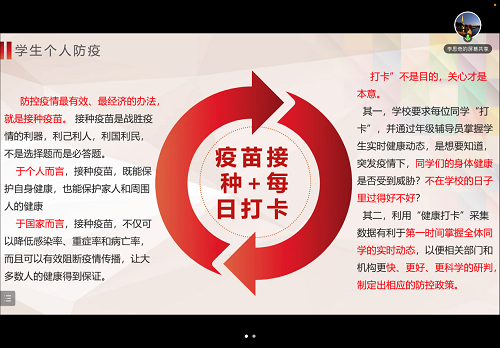 当前,国内新冠肺炎疫情防控形势依然非常严峻,课上解释了为什么要督促同学们落实疫苗接种和坚持每日健康,强调了大学生防控疫情的目的就是让疫情得到稳定,不再爆发,做好自身防护措施,保护好自己。意义就是让人们更好的生活。