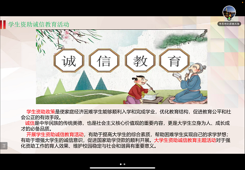 诚信就是诚实守信,中华民族历来把诚实守信作为立身处世之本。作为当代大学生,诚信更是立足于“校园社会”的基本品质,为增强广大学子“资助诚信”意识,构建诚实守信的校园文化氛围,物流管理专业学生党支部积极响应号召,推动资助诚信教育宣传。为了帮助同学们了解我校的各种资助政策,同时为已经获得资助的同学学习征信知识、强化诚信意识,达到资助育人的效果。通过主题教育将国家及学校奖助资助政策工作宣传到位,扩大资助政策宣传的覆盖面,通过加强对借款学生的诚信教育、感恩教育、励志教育,引导学生珍爱信用、理性消费,提高借款学生的征信意识、风险意识和感恩意识,引导学生树立正确的消费观和价值观,增强他们的社会责任感,引导家庭经济困难学生成长成才。