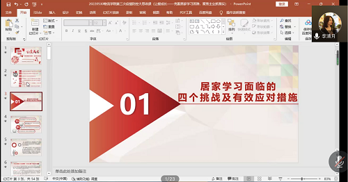 会议伊始,李清月老师向同学们详细的从学习效果、家庭关系、自律精神及心理调适四个方面介绍了居家学习面临的四个挑战,其中包括对因材施教能力的检测、对大学生居家学习期间亲子关系的检验、对学习自主学习时自律精神的检验及对学生心理调适能力的检验。同时老师也向同学们介绍了应对挑战的一些措施,包括同学们要把线上课堂视为“正式的课程”,从心态上做好“开始上课”的准备;对于家庭关系而言,要找到相应的应对之道;对于自律方面,需要有动机、有意识、找组织、定计划;在心理上,也要找到适合自己的调整方式,提出必要时也可以采用约见心理咨询老师的方式进行心理问题的疏导。