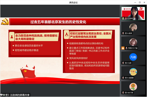 学生党支部学生党员带领全体党员深入学习北京市第十三次党代会报告精神。回顾过去,在实现第一个百年奋斗目标进程中,中国已率先全面建成小康社会;展望未来,在向第二个百年奋斗目标进军新征程中,同样要一马当先、走在前列,力争率先基本实现社会主义现代化,建设好伟大社会主义祖国的首都、迈向中华民族伟大复兴的大国首都、国际一流的和谐宜居之都。