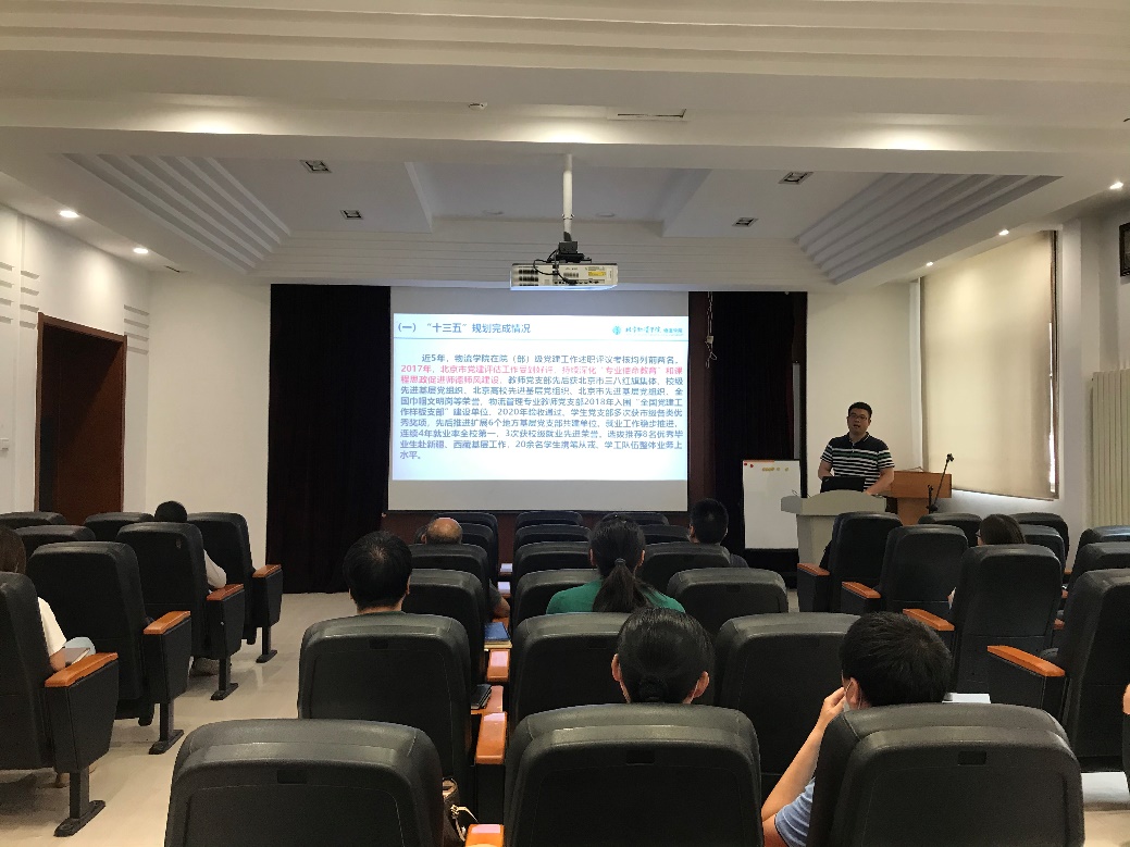 在以上五个方面的建设现状,分析了与其他高校建设的差距,提出了具体的规划指标内容。最后,刘主任从全局观出发凝练了落实立德树人根本任务,全面实施人才培养水平提升工程;优化学科布局,全面实施学科建设水平提升工程;聚焦北京需求,全面实施科研与社会服务能力提升工程;深化人事改革,全面实施人才队伍育人能力提升工程;提升国际合作层次,全面实施国际化水平提升工程;完善治理体系,全面实施治理能力提升工程;坚持和加强党对工作的全面领导七大“十四五”规划主要建设任务。
