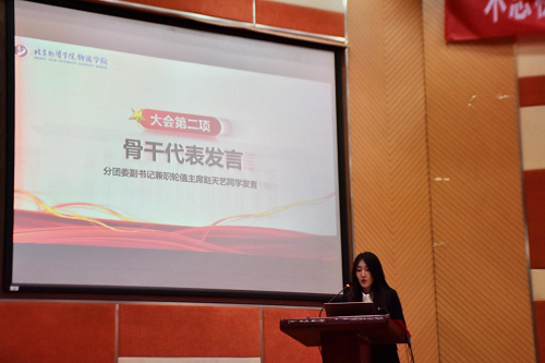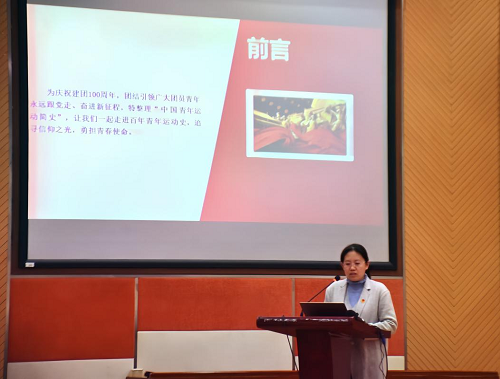 接着进入到大会第四项,由马克思主义学院王晓慧老师讲解《中国青年运动简史》主题团课。王晓慧老师从新民主主义革命时期青年运动、社会主义革命和建设时期青年运动、改革开放和社会主义现代化建设新时期青年活动及新时代青年运动四个方面介绍了团的发展历史,并通过五四爱国运动、雷锋同志的光荣事迹和希望工程等事例生动地展现了各时期的中国青年如何影响和改变中国。前辈们的青春百年奋进史,就是鲜活有声的教科书,王晓慧老师寄语同学们要做到“追寻信仰之光,勇担青春使命”,在新时代的今天,更应努力奋斗,不忘历史,创造不愧于当下的青春。
