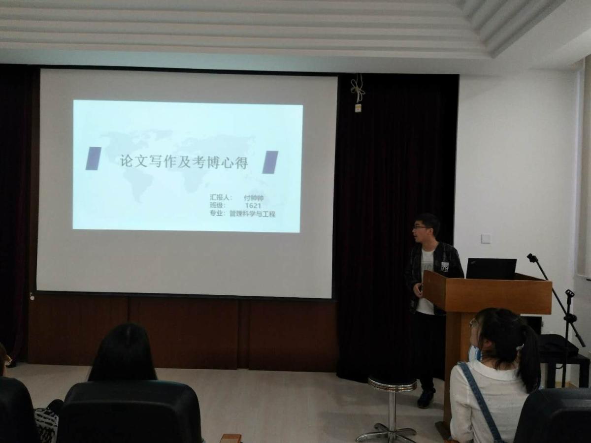 首先,付帅帅同学从科研工作的基础性认知的角度向同学们介绍了什么是科研,并鼓励同学们多写学术论文,积极参加科研项目和科研学术活动,提高自身的科研能力和水平。之后,付帅帅同学向同学们分享了学术论文的写作经验,包括论文的前期准备、论文写作以及论文投稿等方面,鼓励同学们发表核心期刊的论文。最后,付帅帅同学为同学们分享了自己的考博经验,提醒同学们找准自己的目标定位。