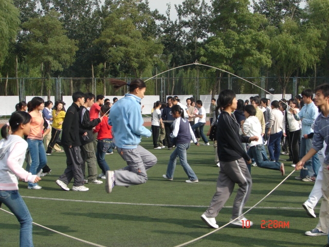 大一年级新生,以班为单位参赛,比赛分为三大项:跳长绳,两人三足和障碍足球。