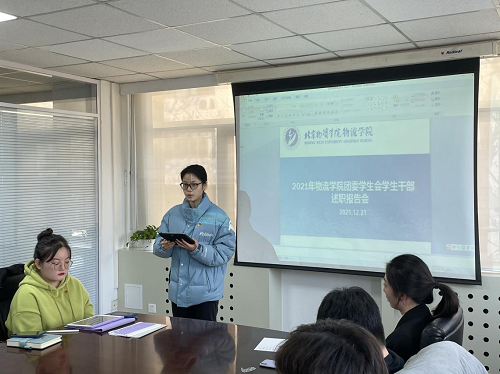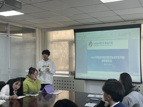 首先,由主席团成员进行述职报告,细数任职以来所取得的工作成果,如开展二级团校课、筹备迎新工作、物流文化节、组织体育比赛、部门招新工作等,能看出活动的成功举办离不开主席团及各部门的团结协作。各位主席团同学从组织学院活动、学生会改革等方面对分团委学生会的工作进行整理汇报,并对自身工作进行反思总结,提出自身工作、分管部门中存在的问题,并提出相应解决措施及进一步打算。