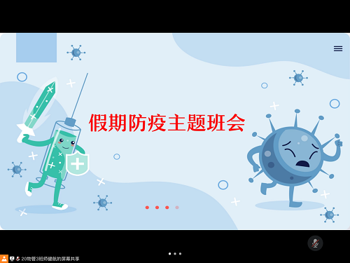 此次寒假防疫主题班会各班根据班级实际情况开展,主要包括强调假期防疫要求等重要事项:一是以班级为单位,班级成员每日相互提醒督促按时进行健康打卡,及时上报体温以及所在实时地理位置,持续提升学院整体“打卡率”,实现统一管理、动态掌握、有效保障;二是传达春节及寒假期间安全教育公告并开展相关教育,重点强调春节期间疫情防控注意事项,做到“防好疫、过好年”;三是讨论疫情影响下2021-2022学年第一学期部分阶段线上课程开展效果,反思凝练、归纳总结、分享经验,同时,集思广益,集体研究第二学期初始阶段保障线上课程效果的相互督促、自我约束有效措施;四是“防疫宣传员”进行多角度、全方位防疫知识科普,让同学们充分了解疫情防控的必要重点,全面提高安全防护的主动意识,有效增强自我管理的切实实效。