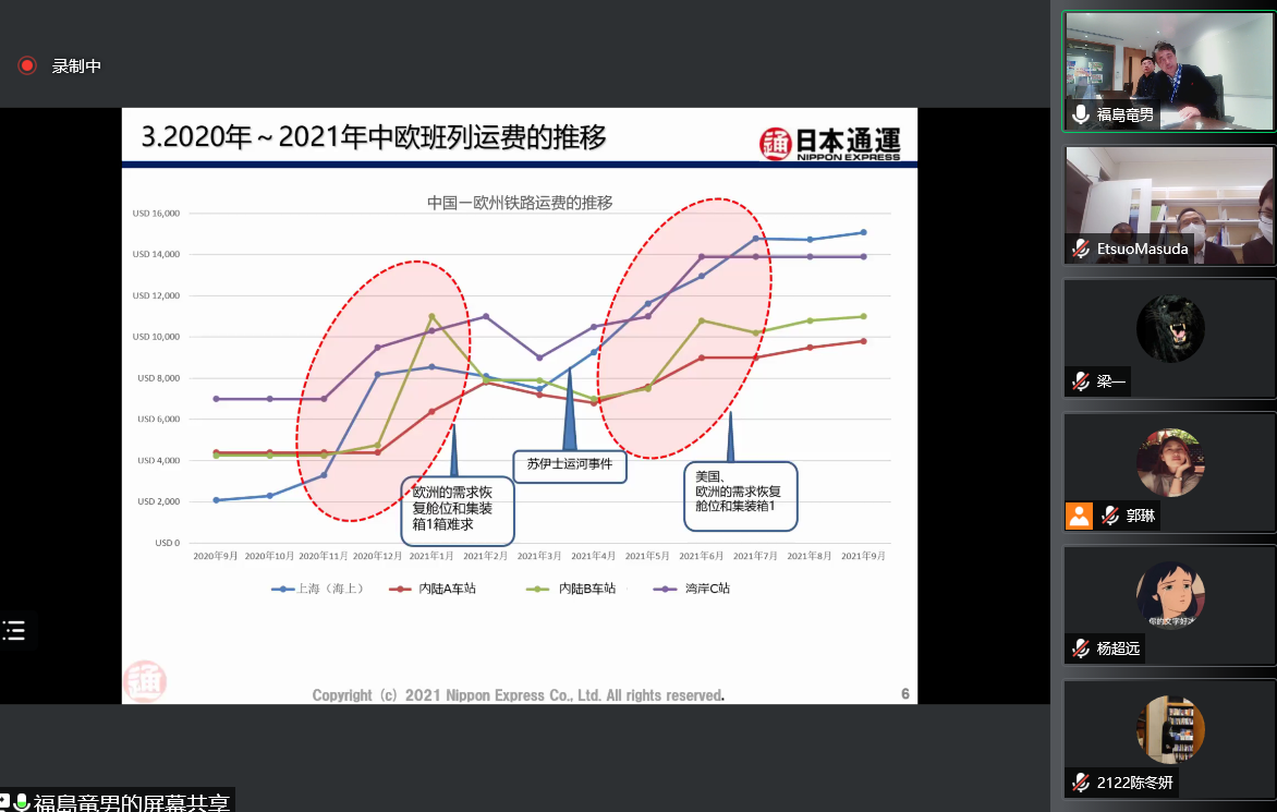 接下来,5位演讲嘉宾分别做了不同主题的精彩演讲。Fukushima Tatsuo部长带来了题为“2021年中欧班列概况和2022年展望”的演讲,Fukushima部长就中欧班列的发展现状以及存在的问题进行了详细讲解,并展望了中欧班列未来的发展趋势。