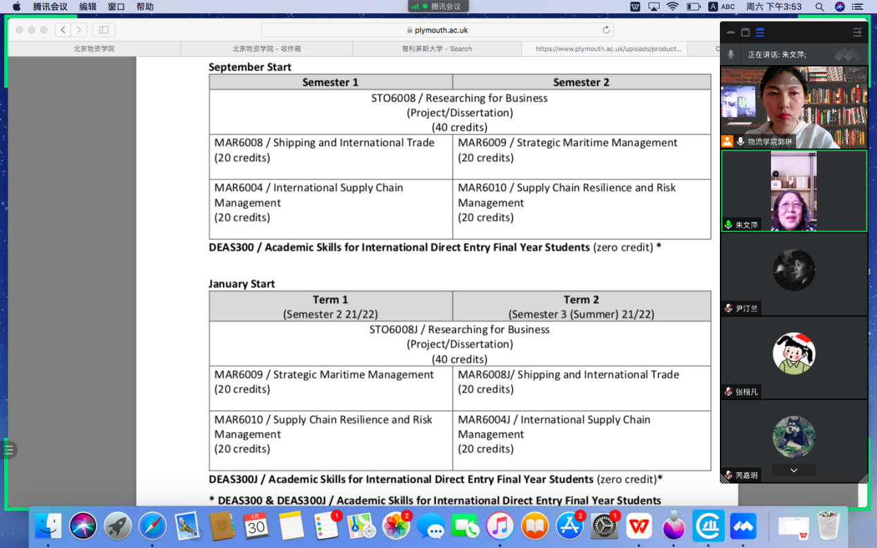 尤物视频 举行英国普利茅斯大学项目沟通会 来源: 发布时间:2022-04-30 浏览次数: 次 2022年4月30日下午,尤物视频 芮嘉明副院长、供应链管理专业张栩凡副主任、对外合作办公室郭琳老师邀请英国普利茅斯大学朱文萍老师一起为国际供应链专业计划赴英国普利茅斯大学学习的三位同学召开线上沟通会。芮院长对学生的学分转换及毕业环节做了解释说明,张栩凡主任对学生的毕业设计等做了说明,郭琳老师对学生毕业环节中的体测等环节进行强调。 学院将继续推进学生的国际化培养,为学生出国学习创造更多机会。