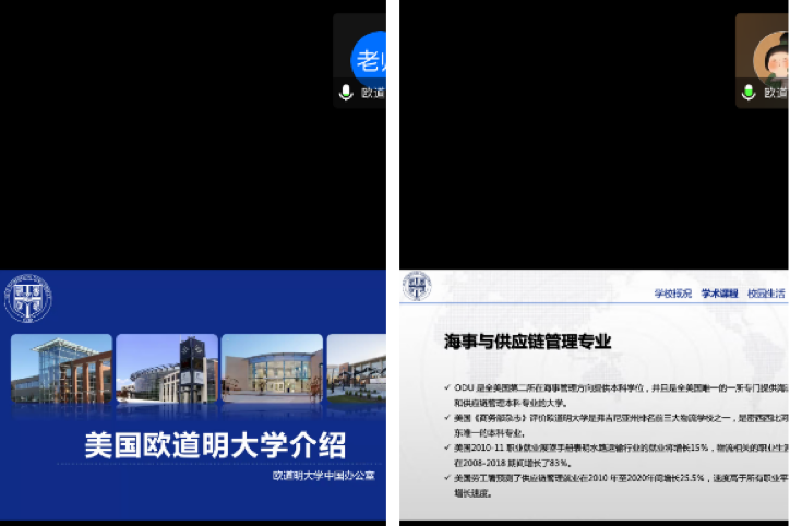 中美联合培养供应链管理专业(国际物流与供应链管理方向)郭文臻同学用视频向同学们展示了学校环境、生活设施并给出了具体实用的学习建议。欧道明大学中国办公室王安然老师介绍了欧道明大学物流相关研究生专业设置及申请步骤并解答了同学们在申请准备中遇到的问题。