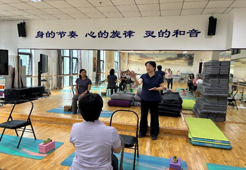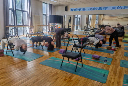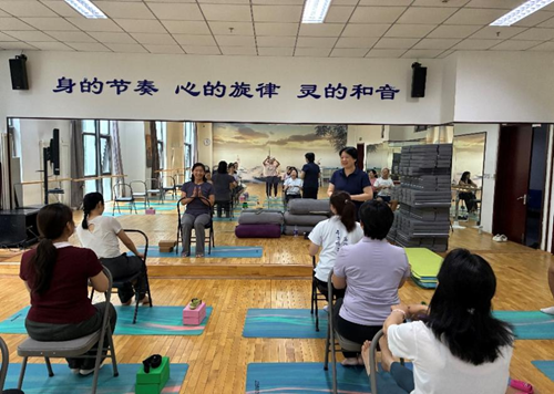 文体馆瑜伽室内,报名教师陆续领取专属瑜伽垫。体育部张秋燕老师聚焦教师工作疼痛点,教授肩颈舒缓拉伸、腰背轻柔扭转及办公间隙放松技巧,还分享身心养护方法,助力教师即时消疲、挺拔体态,更能将健康技巧融入日常。