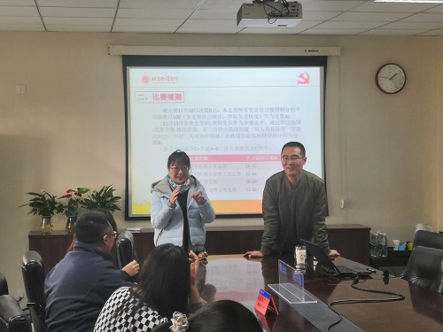 党委书记王红为参赛教师党员做赛前动员,王红书记强调 “不忘初心、牢记使命”主题教育是在全党范围内开展的主题教育,用党的创新理论武装头脑,推动全党更加自觉地为实现新时代党的历史使命不懈奋斗。教师党员以此次比赛为契机,不断深化学习内容,以赛促学、以学促用,让“学习强国”引领学习新风尚,激发学习正能量。