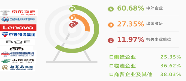 专业毕业生具有明显的专业竞争优势,可进入各类制造、商贸、物流企业从事采购、生产、销售,以及全球供应链的物流运作及管理工作,也可在专业咨询公司、教育培训机构、相关政府部门以及其他社会团体从事物流相关工作。超40%毕业生就职于国内知名大型企业。