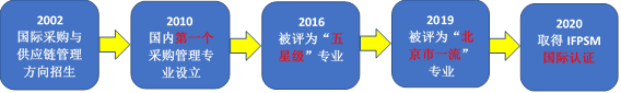 的传统特色和雄厚物资流通研究背景和基础。在中国科教评价网2016年专业排行榜上,采购管理专业被评为5星级,在全国8所开设采购管理专业高校中排名第1。2019年,获批北京市一流本科专业建设点。2020年获得由国际采购供应与管理联盟颁发的国际认证。