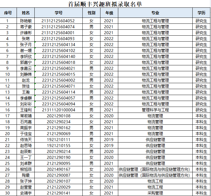 关于首届顺丰兴趣班面试结果的公示 来源: 发布时间:2022-10-11 浏览次数: 次 经过北京顺丰速运有限公司线上简历投递、线上测评、线下面试环节,以下30位同学入选首届顺丰兴趣班。拟录取名单如下: 特此公示。 公示日期:2022年10月12日-2022年10月14日 尤物视频 2022年10月11日