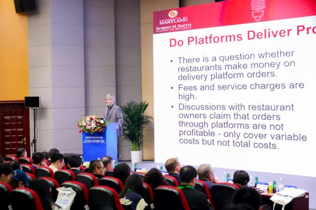 Martin Dresner, Professor at the University of Maryland, presented a topic titled Focusing on Online Sales by Integrating Last-Mile Platforms. Using chain restaurants as an example, he explored how cooperation with delivery platforms impacts their sales. His research showed that collaboration with delivery platforms helps increase direct channel sales. As the number of platform partners grows, the frequency of direct channel transactions and basket size also increase. He discussed strategies to guide customers from delivery platforms to direct channels.