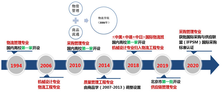 *北京市第一批开设“供应链管理专业”。至此,形成了以物流管理、供应链管理专业为主干,物流工程专业、采购管理专业、质量管理工程专业为支撑的全系统、全覆盖、全链条的现代物流教育完整体系。