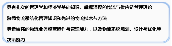 秉承立足本土、遵循立德树人的教育理念,培养身心健康、勇于担当、独立思考与自主学习能力较强、具备良好的职业素养、国际视野和创新精神,能够胜任大型企业、跨国公司物流运营管理、国际物流运作管理等工作的高层次物流管理复合型应用人才。